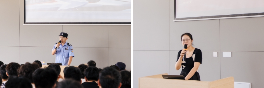 法治专题讲座率先开讲。来自潞城派出所的虞康警官以“防盗、防诈”为主线,用鲜活案例提醒新生“指尖轻点也可能踏入深渊”。