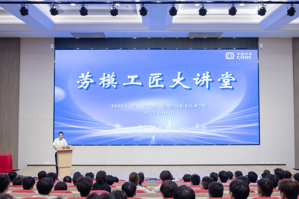 为贯彻落实中车集团党委大思政课建设决策部署,大力弘扬劳模精神、劳动精神、工匠精神,激励广大师生树标杆、当典范、作表率,10月14日,常铁院联合中车高铁工匠学院共同举办了2025年第三期“劳模工匠进校园”活动。本次活动特邀中车首席技能大师、全国劳动模范、学校杰出校友廖仲宾回到母校,为师生代表们带来一场精彩的事迹报告会。学校校长、党委副书记陈刚,党委副书记、纪委书记、工会主席张喜民和学校相关部门负责人、教师代表及2025级学生代表共计260余人现场聆听了报告。活动由学校工会副主席高羽主持。