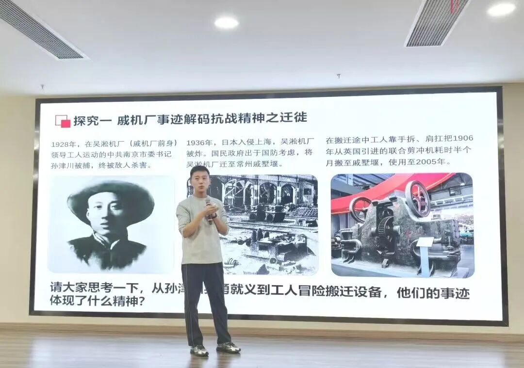 授课展示环节,刘本佳以《熔铸铁道魂:从中车戚机厂抗战史中感悟伟大抗战精神》为题,带来了一堂沉浸式思政课。课程立足学校轨道交通行业特色,将中车的红色文化资源转化为思政课的教学内容,深挖常州本地工业文化底蕴,通过史料讲解、场景还原、互动研讨等多种形式,引导学生深刻感悟以爱国主义为核心的伟大抗战精神,在历史与现实的交融中坚定理想信念、厚植家国情怀。