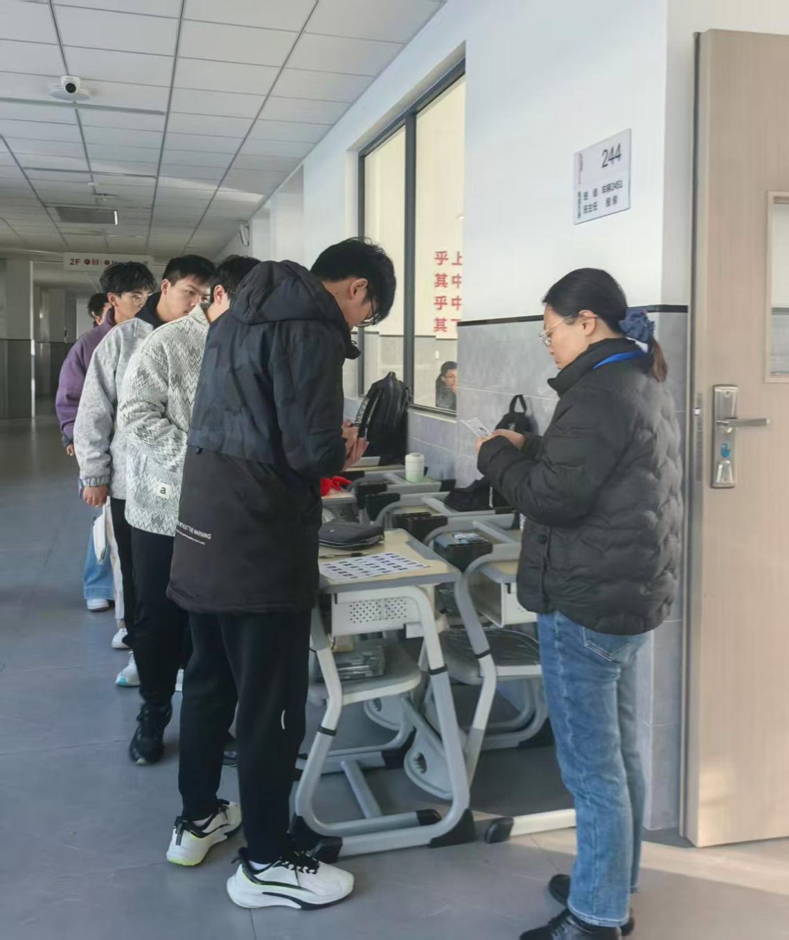 考试当日,副校长朱月红与校外巡考老师深入考场全程巡视检查。考生们手持准考证、身份证,在监考教师的引导下有序进入考场,完成身份核验、签到落座等流程。监考教师严格执行监考规程,仔细核对考生信息,及时提醒考试时间,全程维护考场纪律;考生们专注答题、沉着应考。