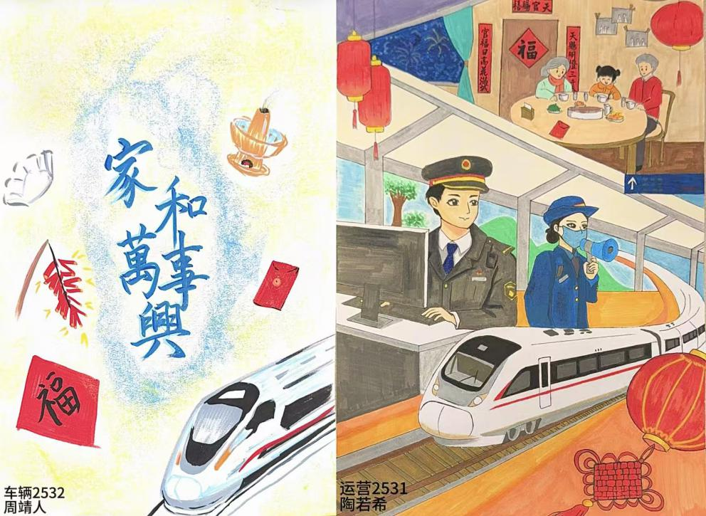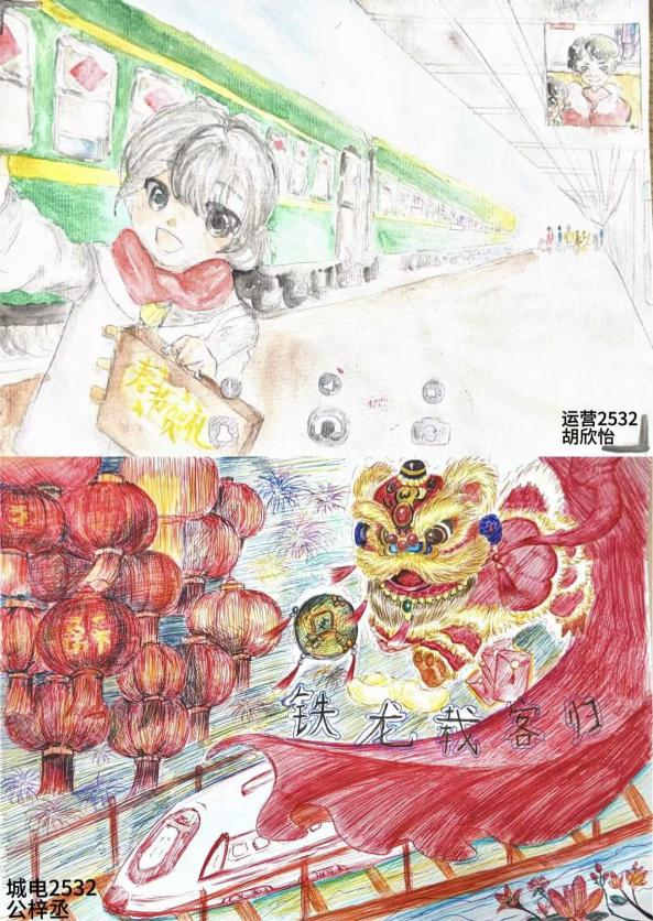 作品中,有的同学以细腻笔触描绘阖家团圆、贴春联、挂灯笼的温馨场景,将传统年味与家风家训娓娓道来;有的聚焦春运一线,刻画轨道交通人坚守岗位、精检细修、暖心服务的动人画面,展现“小家团圆”与“大国交通”的紧密相连。每一件作品创意十足、意蕴深远,既展现了同学们扎实的艺术素养,更传递出对家庭的珍视、对家国的热爱,以及作为未来轨道交通建设者的责任与自豪。