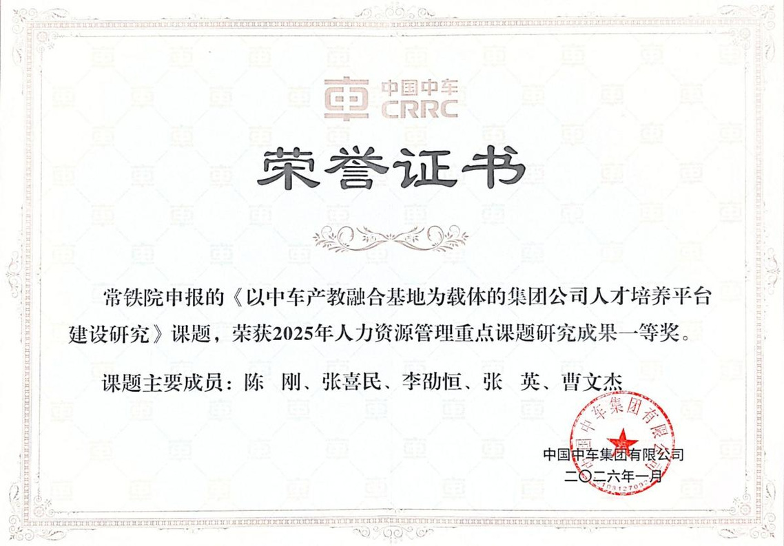 近日,中国中车集团有限公司发布《关于表彰2025年度人力资源管理重点课题研究优秀成果的通知》,学校申报课题《以中车产教融合基地为载体的集团公司人才培养平台建设研究》凭借扎实的研究内容、创新的实践思路和较高的应用价值,从众多研究课题中脱颖而出,荣获一等奖,这是学校在人才培养领域研究的又一重要成果。