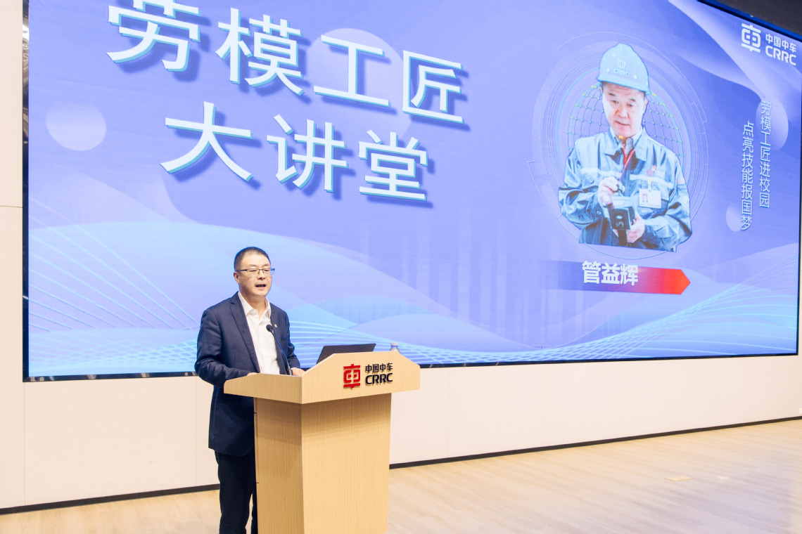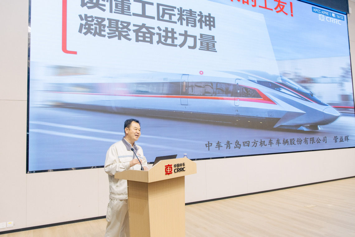 管益辉以“读懂工匠精神,凝聚奋进力量”为主题,结合三十余年的奋斗历程作主题分享。他用朴实的语言、鲜活的事例,讲述了自己从机械加工操作工起步,扎根高铁转向架制造领域34年的成长故事。从“和谐号”到“复兴号”,从传统加工到数字工匠,他带领团队攻克动车关键零部件轴箱体进口依赖难题,实现“复兴号”轴箱体全工序国产化,被誉为“为中国复兴号高铁装上国产膝盖”;他深耕岗位创新,斩获多项专利与科研成果,推动实现高铁关键部件加工的效率飞跃与数字化转型;他以“择一事,终一生”的精神践行传帮带,培养出一大批全国技术能手、行业技能专家和高技能人才。