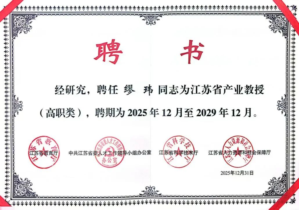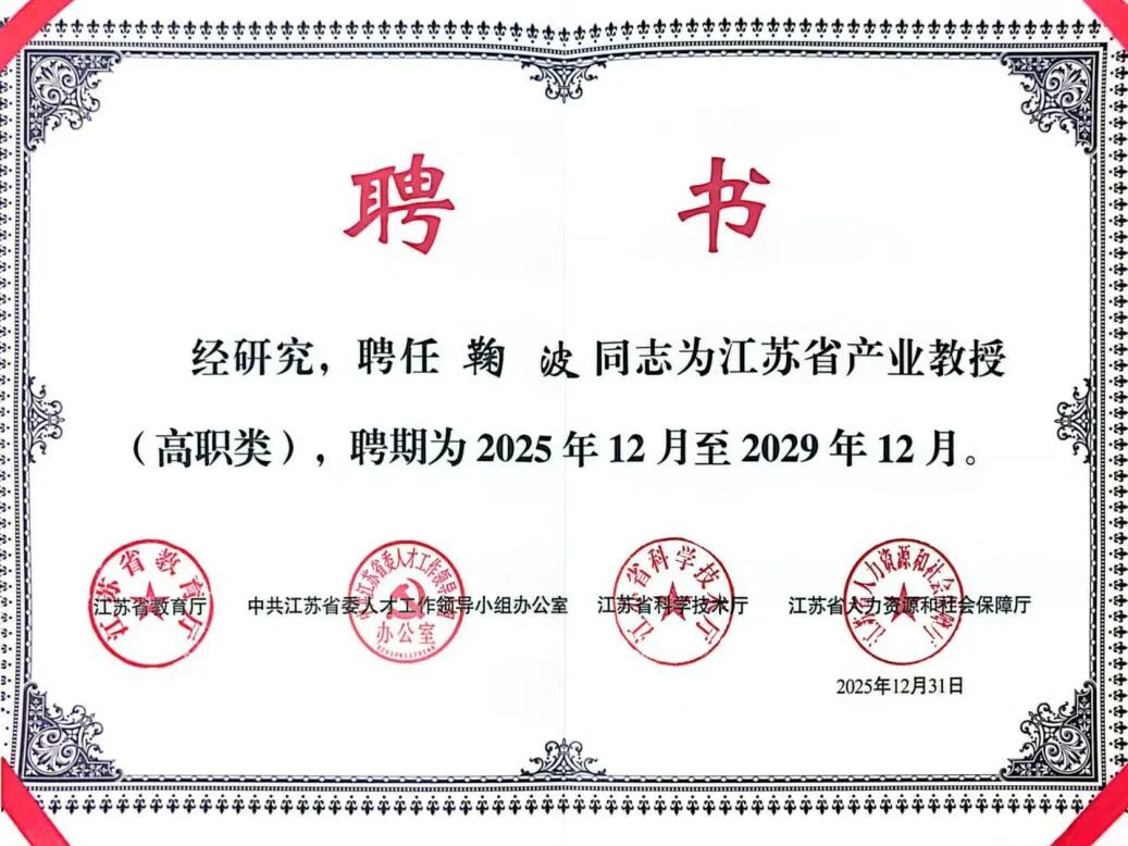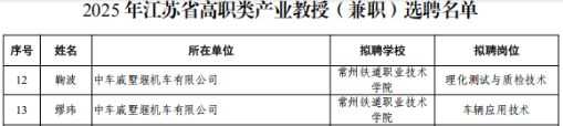近日,江苏省教育厅、省委人才办、省科技厅、省人力资源和社会保障厅联合发布《省教育厅等四部门关于公布2025年江苏省产业教授(兼职)选聘名单的通知》(苏教研函〔2025〕9号)。学校推荐的缪玮、鞠波2位企业大师成功获聘为江苏省高职类产业教授。