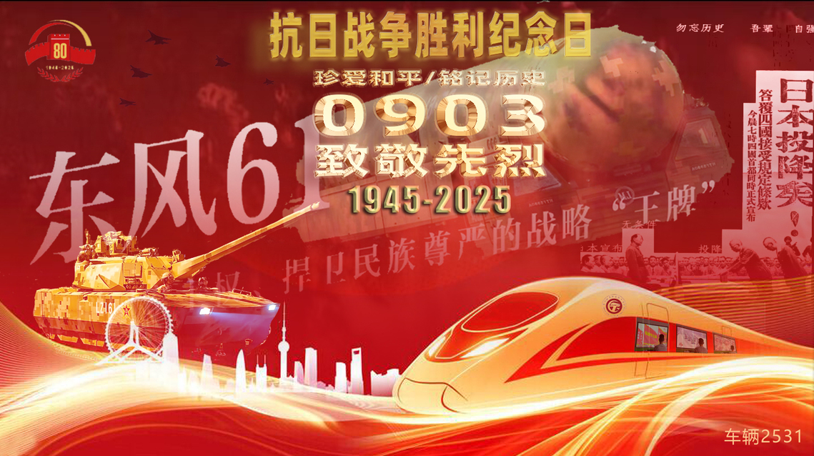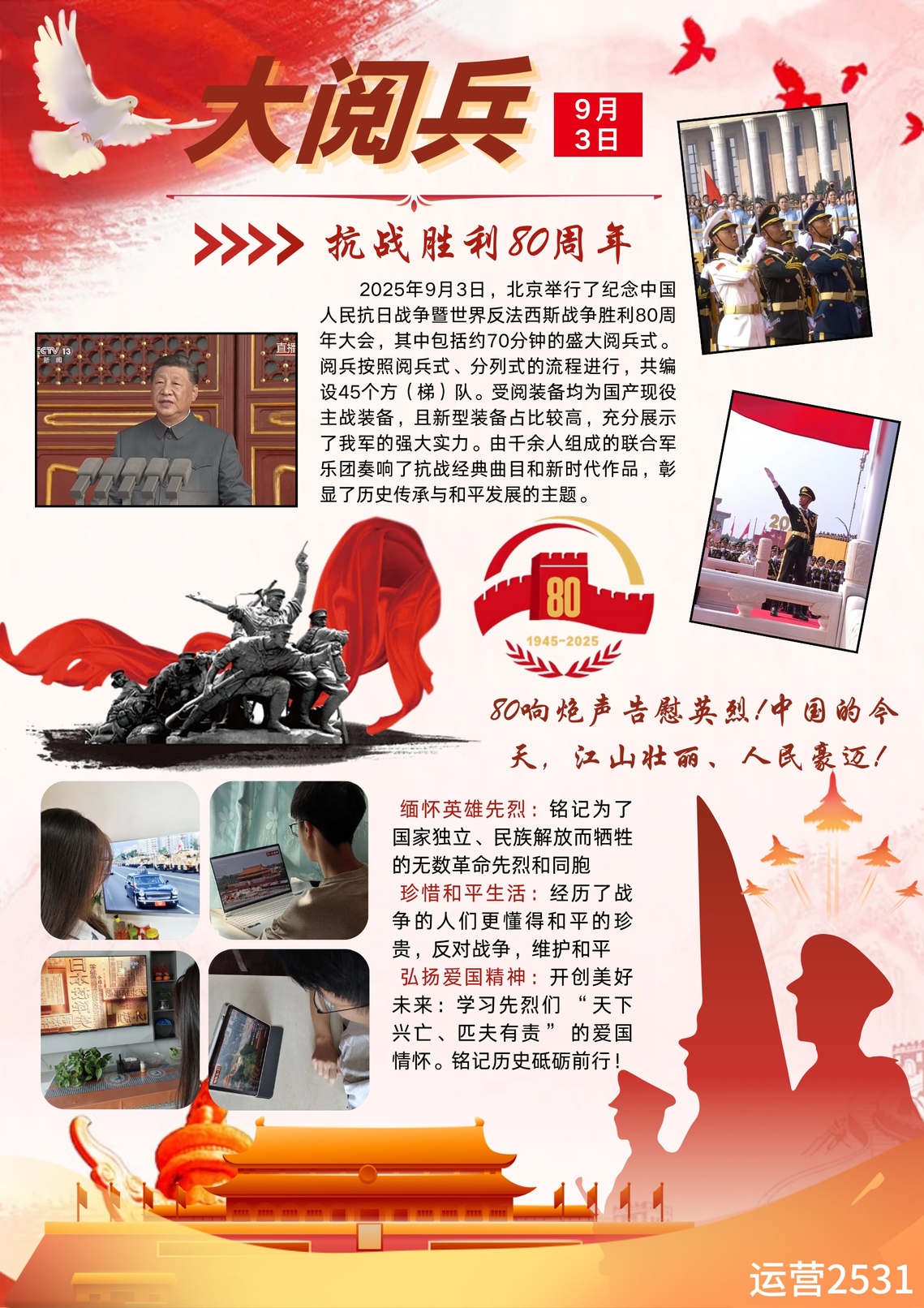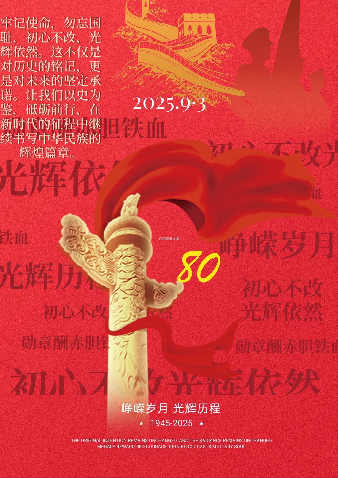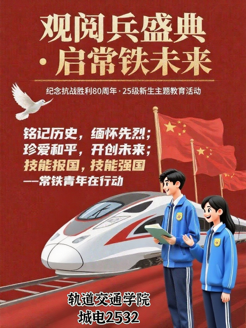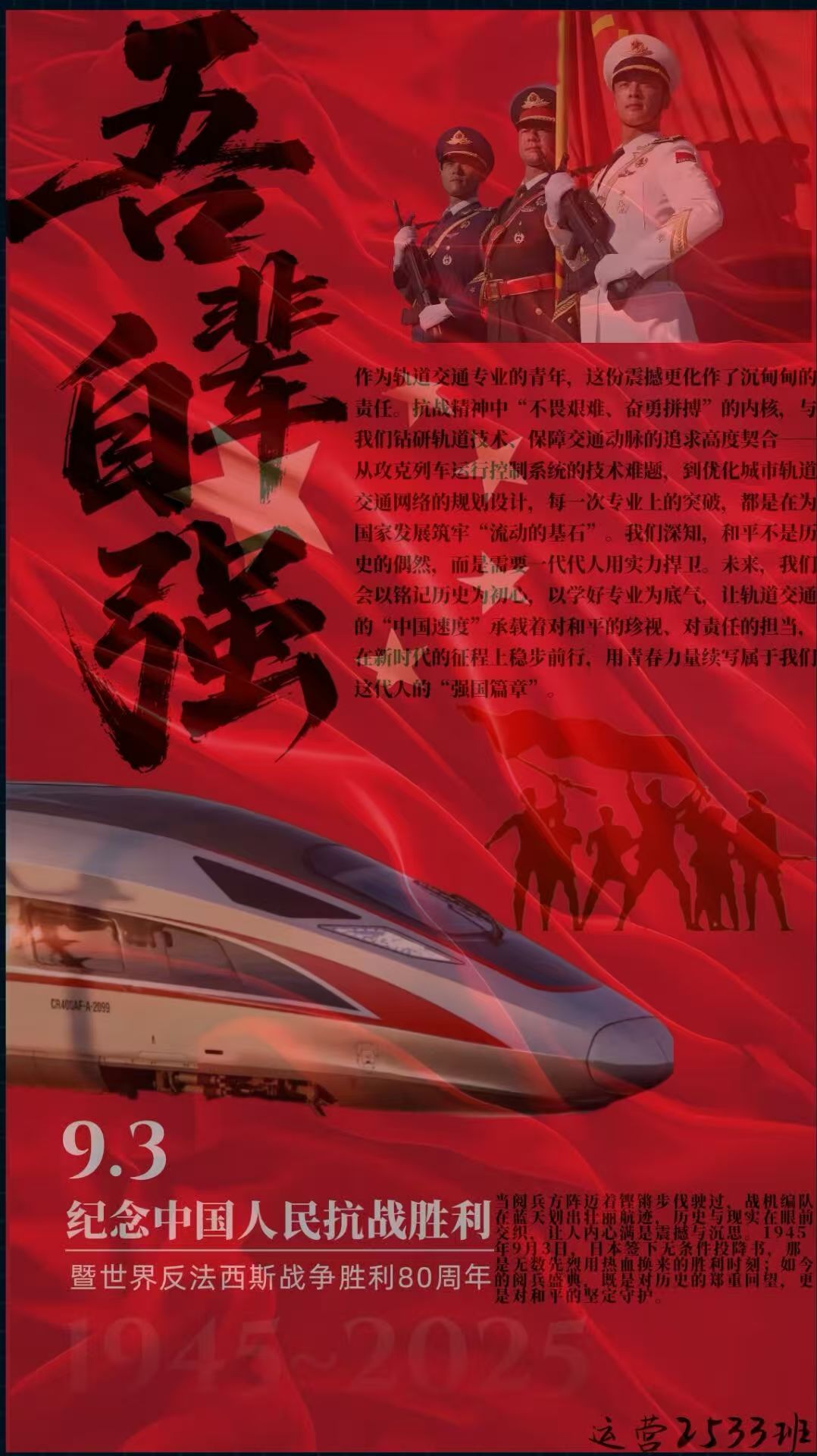 为纪念中国人民抗日战争暨世界反法西斯战争胜利80周年,讴歌中华民族在艰苦卓绝的斗争中锻造出的伟大抗战精神,激发新时代青年大学生的爱国热情与民族自豪感,轨道交通学院于2025年9月3日组织25级全体大一新生观看纪念中国人民抗日战争暨世界反法西斯战争胜利80周年大会并开展了主题海报制作活动。