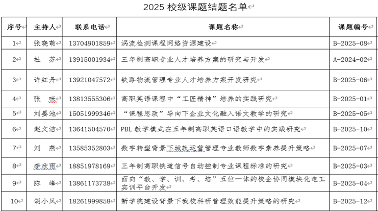 经专家组评议,对《三年制高职专业人才培养方案的研究与开发》、《新学院建设背景下我校科研管理效能提升策略的研究》等10项课题给予结题。