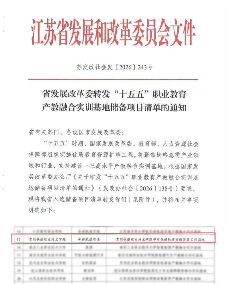 近日,江苏省发展和改革委员会转发国家“十五五”职业教育产教融合实训基地储备项目清单的通知,中国中车集团在学校建设的“中车先进轨道交通装备实训基地”成功入选,为打造轨道交通行业产教融合创新高地提供了强力支撑。