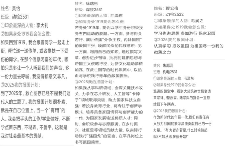 观影过程中,学生们全神贯注,被那段波澜壮阔的历史深深震撼。机电2531班学生纪添昊同学在“家国三问”微感言中写道:“问,1919我会这么做?用《新青年》的启蒙之光,燃五四街头的觉醒之火。答,我们是谁?是前辈精神的传承者,是强国路上的接力者。往,向何处去?以专业本领服务社会,以实干担当报效国家。”观影结束后,各班通过扫码提交感言,累计收集微感言240余条,字字句句饱含深情,展现了青年一代对“家国”二字的深刻理解。