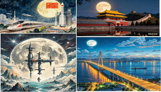 学生们积极尝试将人工智能技术与艺术创作相结合,探索“科技+艺术”的新表达。当高铁与火箭在月光下同框,故宫红墙与长城脊线共沐清辉,空间站机械臂舒展于月轮前,跨江大桥灯串揉碎月色,绘就中国创新图景。