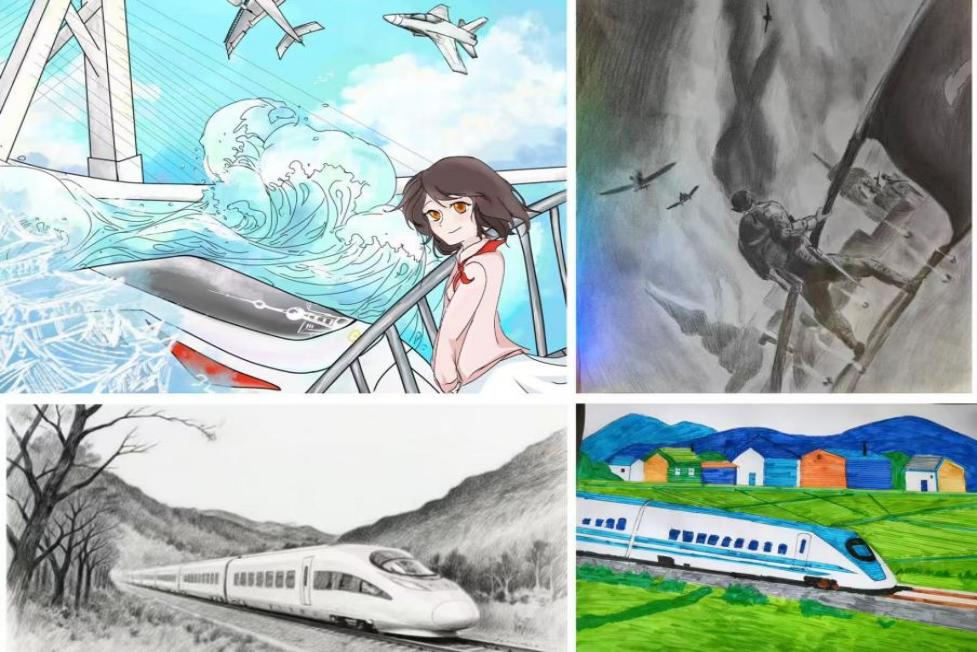 在“笔绘山河”绘画比赛中,学生们围绕“山河新貌”“校园风采”“平凡英雄”三大主题展开创作。机电2531班的任雨晴同学用二次元风格营造出超现实的视觉体验,为大众呈现了一场关于高铁与海浪想象的创意盛宴,仿佛高铁在“水浪”与“天空” 的奇幻场景中穿梭;机电2532班的张洪铭的素描《水墨山林中的钢铁速度》描绘高铁疾驰于山林铁轨间,枯树山峦相伴,尽显速度与自然的融合之美;更有以战争为题,战士挥旗,硝烟战场战机盘旋,展现坚毅与热血。
